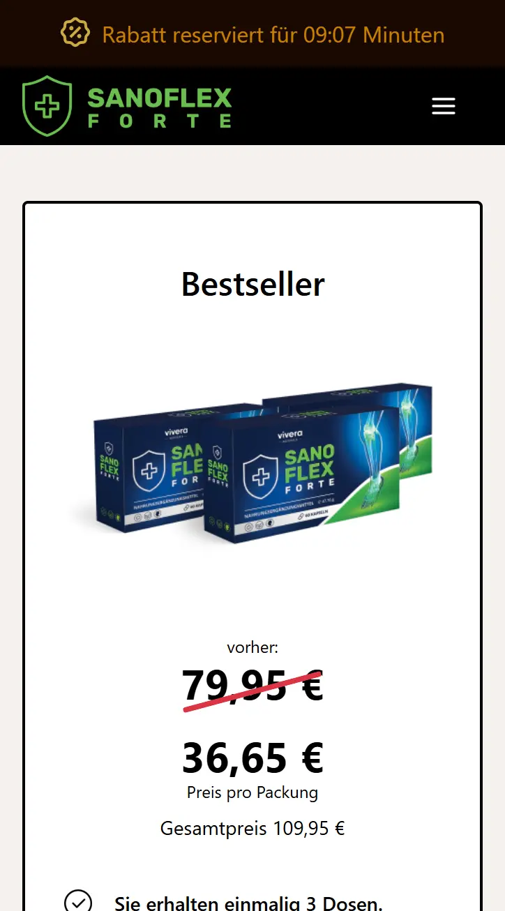 Sanoflex wird als Nahrungsergänzungsmittel beworben, das die tägliche Beweglichkeit und Gelenk-Unterstützung begleiten soll. Unten finden Sie eine kurze Zusammenfassung und den direkten Link zur offiziellen Bestellseite (Pakete, aktuelle Rabatte, Versand, Zahlungsarten).